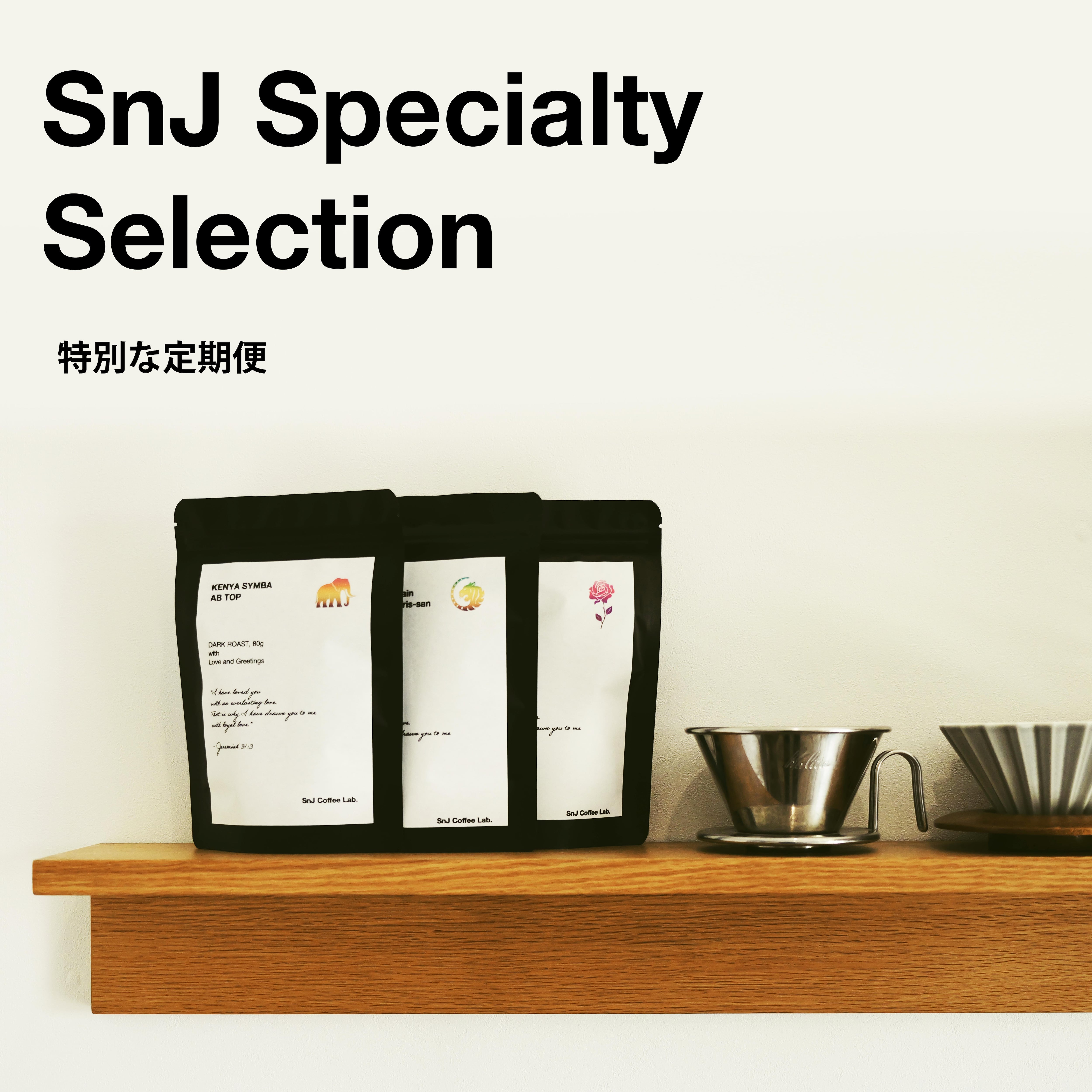 …この説明に、「うんうん、そうそう!」と思っているあなたに、そしてそんなコーヒーの世界の扉を開けてみたいあなたにおすすめしたいのが、SnJ Specialty Selection です。SnJ Coffee Lab.が世界中から仕入れた豆を吟味して、その中から厳選した3種をお届けします。それぞれにおすすめのレシピをつけるので、まずはその方法で淹れてみてください。